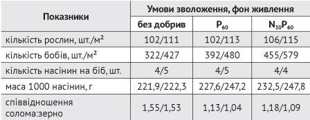 Дослідженнями встановлено, що такі елементи структури врожаю гороху, як кількість рослин, кількість бобів та маса 1000 насінин визначали рівень урожаю. Результати досліджень вказують на те, що за рахунок зрошення та внесення добрив кількість рослин збільшилася на 9-11 шт./м² і становила 111-115 шт./м² залежно від фону живлення (табл. 2). Застосування добрив позитивно впливало на кількість бобів. Так, на зрошенні на фоні Р60 та N30P60 кількість бобів збільшилася на 53 шт./м² та 152 шт./м² відповідно порівняно з фоном без добрив, причому урожайність на фоні N30P60 підвищилася на 0,63 т/га.