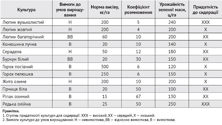 Ґрунтово-кліматичні умови України дають змогу висівати на зелене добриво велику кількість культур (табл. 1).