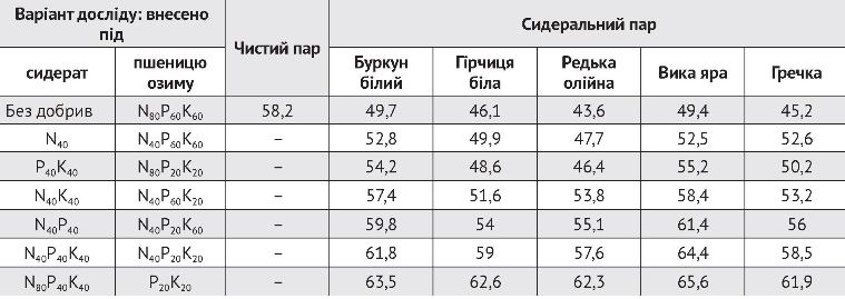Як видно з даних табл. 2, найефективнішим є варіант із внесенням під сидерат N80P40K40 і P20K20 під пшеницю озиму. За вирощування на сидерат буркуну білого або вики ярої можна обмежитися внесенням під них лише N40P40 або N40P40K40.