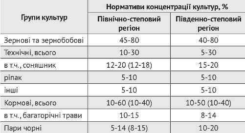 Регулювання концентрації в сівозмінах і структурі посівних площ зернових і кормових культур допускає значний їх діапазон (45-80 — зернові і 10-60 — кормові), який залежить від спеціалізації господарств (див. табл.).