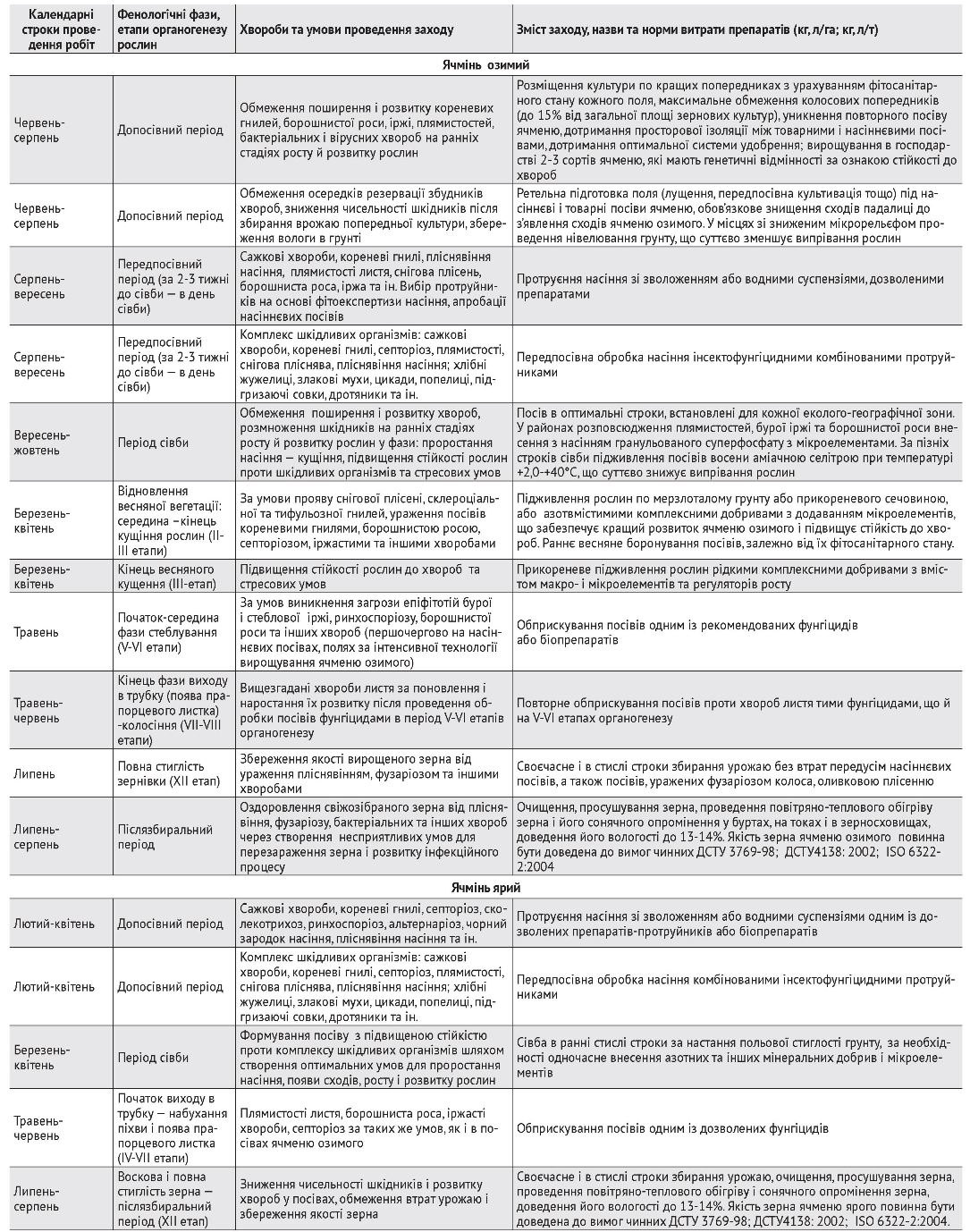 Проти комплексу шкідливих організмів: сажкові хвороби, кореневі гнилі, септоріоз, плямистості, снігова пліснява, пліснявіння насіння; хлібні жужелиці, злакові мухи, цикади, попелиці, підгризаючі совки, дротяники насіння ячменю обробляють комбінованими інсектофунгіцидними протруйниками на основі діючих речовин: