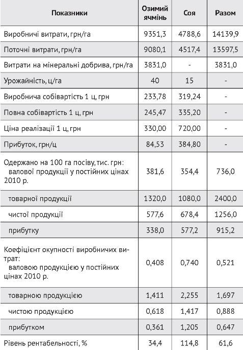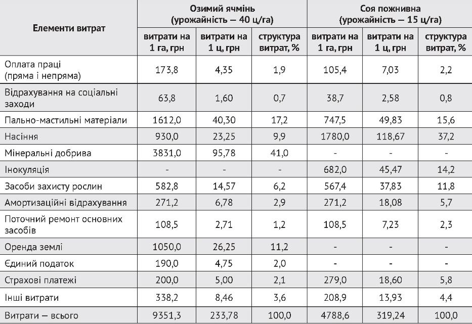 Згідно з прогнозними розрахунками, витрати на 1 га вирощування озимого ячменю становитимуть 9351,3 грн, при цьому орієнтовні витрати на вирощування пожнивної сої після озимого ячменю дорівнюватимуть 4788,6 грн/га (відносно нижчі витрати пов’язані з тим, що за вирощування пожнивних посівів сої деякі статті витрат, як-то оренда землі, єдиний податок, узагалі відсутні, бо віднесені на основну культуру). При цьому витрати з розрахунку на 1 ц продукції становитимуть відповідно 233,78 грн та 319,24 грн, що відповідає економічним реаліям сьогодення. Найбільшу питому вагу в структурі вирощування пожнивної сої займають витрати на насіння, пально-мастильні матеріали та інокуляцію.
