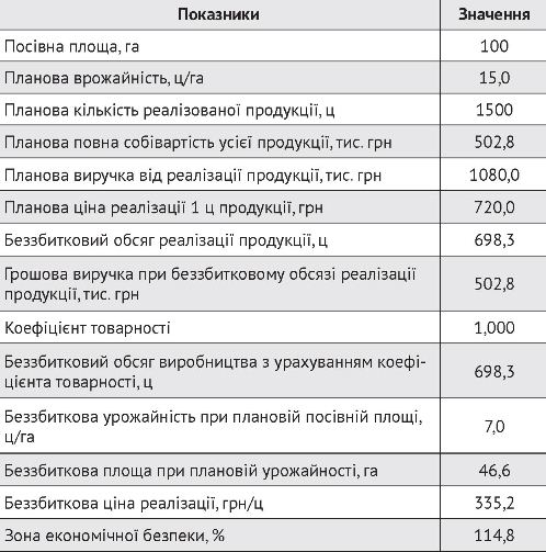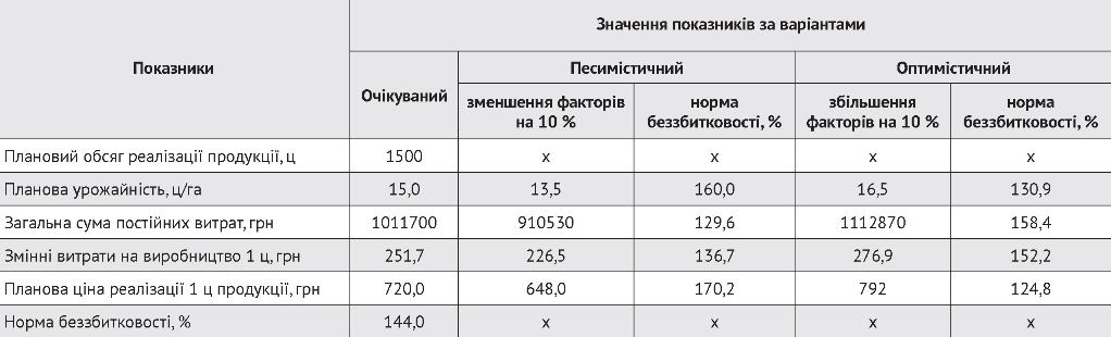 Норма беззбитковості формується під впливом таких факторів, як: плановий обсяг реалізації продукції, планова урожайність, загальна сума постійних витрат, змінні витрати на виробництво 1 ц продукції та планова ціна реалізації 1 ц сої. У результаті розрахунків з’ясовано, що за очікуваним варіантом норма беззбитковості становить 144 %, що дає змогу виробнику через виникнення несприятливої ситуації знизити обсяг виробництва в 1,4 разу, не зазнаючи при цьому збитку.