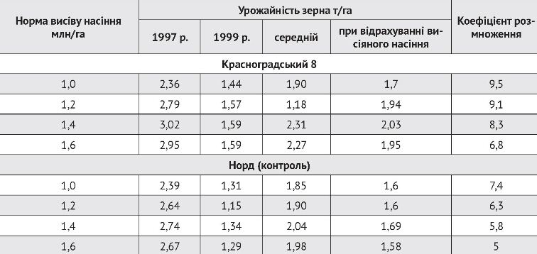 Поряд з цим дослідження Ерастівської дослідної станції свідчать, що норму висіву насіння гороху Красноградський 8 можна збільшувати до 1,4 млн/га (див. табл.). При цьому врожай зерна підвищується відносно норми 1,2 млн/га на 0,12 т/га, а порівняно з нормою 1 млн — на 0,41 т/га. Останнє підтверджує добру реакцію сорту на збільшення норми висіву, тобто на його толерантність до загущення рослин. Слід також наголосити, що коефіцієнт розмноження насіння при цьому майже не зменшується.