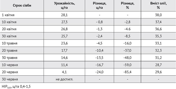 Найвища врожайність ярого ріпаку формується за ранніх строків сівби (табл. 1). За сівби у період з 1 по 30 квітня урожайність знаходиться у межах 25,7-28,1ц/га, різниця між варіантами становить лише 0,8-2,4 ц/га.