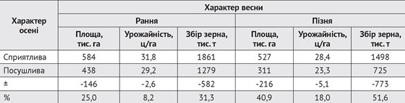 Навіть на полях із добре розвиненими посівами оптимальних строків сівби за низьких запасів вологи весною відбувається недобір зерна, але меншою мірою. Навпаки, в роки, коли весною запаси вологи високі, то навіть слабко розвинені з осені посіви забезпечують задовільний урожай зерна — 25-30 ц/га і більше.