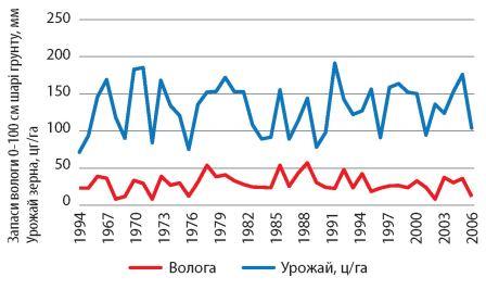 Проте головним фактором, який визначає рівень урожаю озимої пшениці в зоні Степу, є волога. Кількість вологи на посівах весною значно впливає на ріст, розвиток і рівень її врожаю. У роки, коли на початку весни запаси вологи на посівах низькі, то вони залишаються низькими до кінця вегетації і формується низький урожай зерна. Поповнення запасів вологи в ґрунті від літніх дощів майже не відбувається, тому що їх ефективність дуже низька — 20-25%. У той же час, високі запаси вологи весною, як правило, забезпечують високі врожаї озимої пшениці, навіть за недостатньої кількості опадів у весняно-літній період вегетації (рис. 3).