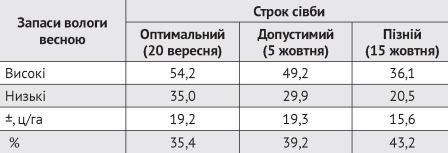 сівби і різних запасах вологи на посівах весною, ц/га