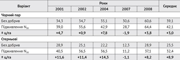 Одним із найбільш ефективних заходів, який дозволяє значно підвищити врожайність і якість зерна озимої пшениці, є підживлення посівів азотними добривами. Підживлення стимулює ріст і кущення рослин, збільшує кількість продуктивних стебел та забезпечує прибавку врожаю 3-9 ц/га і більше. При цьому азотні добрива більшу віддачу забезпечують на бідних ґрунтах, непарових попередниках та неудобрених посівах. Так, у наших дослідах підживлення пшениці на чорному пару забезпечувало прибавку врожаю в середньому 3 ц/га, а по стерньових — 8,9 ц/га, або в 2,5-3 разів більшу (табл. 3).