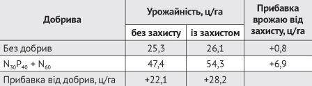 Добрива дають значно більшу віддачу на ділянках, де проводиться захист рослин. Так, без захисту рослин добрива в дозі N30Р40 до сівби і N60 весною у підживлення забезпечували прибавку врожаю 22,1 ц/га, а із захистом — 28,2 ц/га, що на 6,1 ц/га більше (табл. 4).