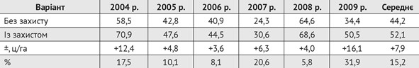 Для формування здорового агроценозу та одержання високого врожаю пшениці виключно велике значення має комплексний захист рослин від бур’янів, хвороб і шкідників. У наших дослідах надбавка врожаю від захисту рослин становила в середньому за 5 років 7,9 ц/га з коливаннями по роках від 3,6 до 16,1 ц/га, а в процентному відношенні — від 5,8 до 31,9% (табл. 5).