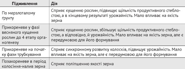 Ефективність використання азотних добрив у системі ранньовесняних підживлень залежить від строків та способів їх внесення. Дія азоту у ті чи інші фази росту та розвитку рослин озимої пшениці абсолютно різна. Чим раніше проводиться ранньовесняне підживлення, тим більшими є сподівання на підвищення урожайності, а чим пізніше — тим більш ймовірне поліпшення якісних показників зерна (табл. 1).