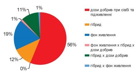 Нашими дослідженнями встановлено, що найвагомішу частку впливу на формування урожайності гібридів соняшнику відмічали у фактору «дози добрив», який становив 56% (рис. 1). Частка впливу фактору «фон живлення» сягала 19%.