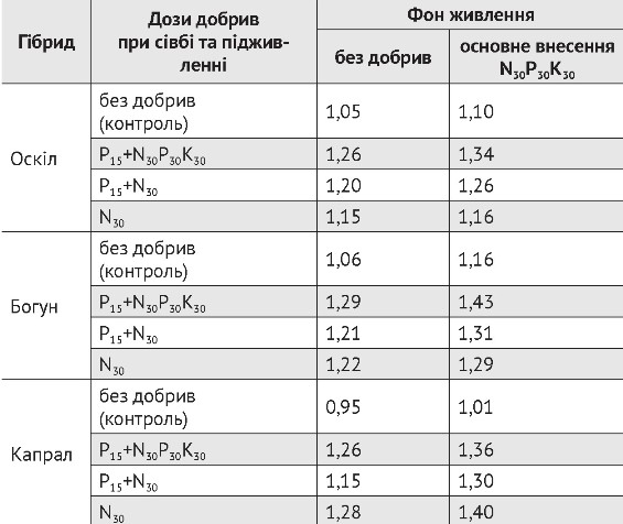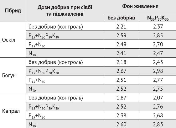 Як свідчать результати досліджень, на фоні без добрив найкращим варіантом, за якого було отримано найбільшу урожайність, виявилося комплексне застосування припосівного внесення добрив та підживлення у дозі N30Р30К30. Наприклад, у ранньостиглого гібрида Оскіл урожайність збільшилась на 0,38 т/га, що сягало 17,2% порівняно із варіантом без добрив (табл. 1). При внесенні у рядки Р15 і підживленні у дозі N30 та у варіанті із застосуванням лише підживлення N30 урожай поступово знижувався до 2,49 т/га та 2,41 т/га відповідно.