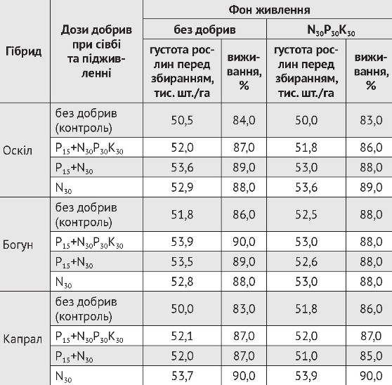 Так, у ранньостиглого гібрида Оскіл найменшу густоту рослин відмічали на фоні без добрив за контрольного варіанту, яка становила 50,5 тис. шт./га (табл. 2). У середньораннього гібрида Богун на фоні без добрив у варіанті Р15+N30Р30К30 спостерігали найбільшу густоту рослин перед збиранням, яка становила 53,5 тис. шт./га. Це можна пояснити тим, що наявність фосфору у добривах сприяло кращому розвитку кореневої системи та більш повному збереженню рослин протягом періоду вегетації.