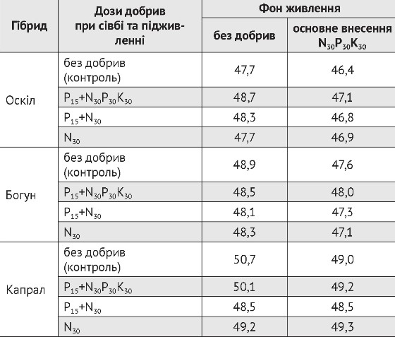 На фоні без добрив олійність середньораннього гібрида Капрал найбільшою була за контрольного варіанту та за варіанту Р15+N30Р30К30 і становила 50,7% та 50,1% відповідно.