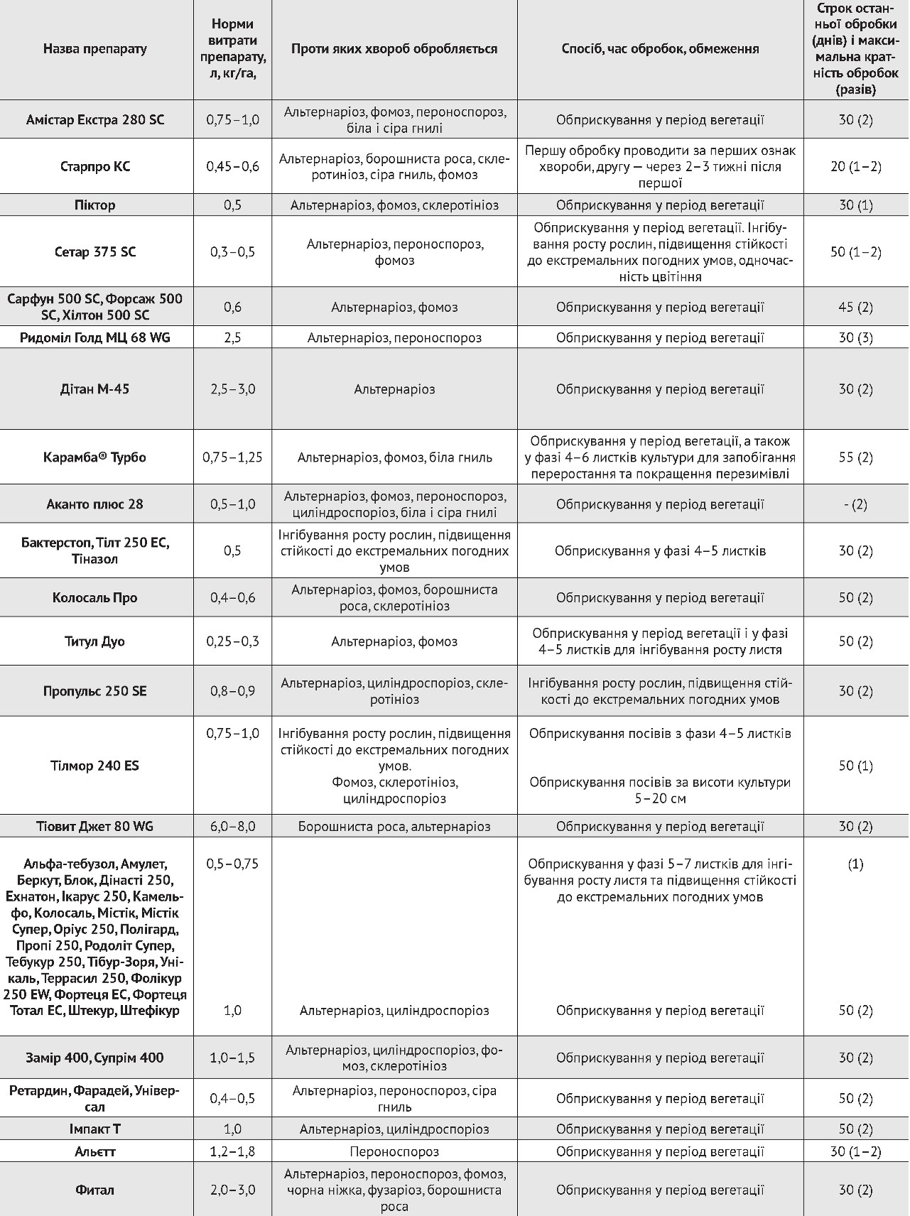 На посівах ріпаку проти хвороб використовують фунгіциди, наведені у таблиці 2.