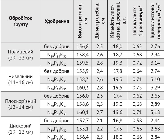 Слід зазначити, що запаси продуктивної вологи в шарі 0–10 см перед сівбою соняшнику на дослідних ділянках варіювали в межах 12–15 мм, тобто були достатніми для отримання повноцінних сходів. Тому деяке зростання інтенсивності ростових процесів за полицевого обробітку відносно мульчувального на фоні без добрив ми пояснюємо насамперед вищою біологічною активністю ґрунту. Внесення мінеральних добрив нівелювало цю відмінність, тому за параметрами росту вегетативних органів чизельний і плоскорізний обробітки не поступались оранці. Гірші біометричні ознаки рослин за дискування зумовлені сукупним впливом факторів, пов’язаних із поживним режимом ґрунту (гальмування нітрифікації), ущільненістю піднасіннєвого прошарку 10–20 см (об’ємна маса — 1,32 г/см3, твердість — 15,6 кг/см²), а також технологічними аспектами проведення польових робіт (табл. 1).