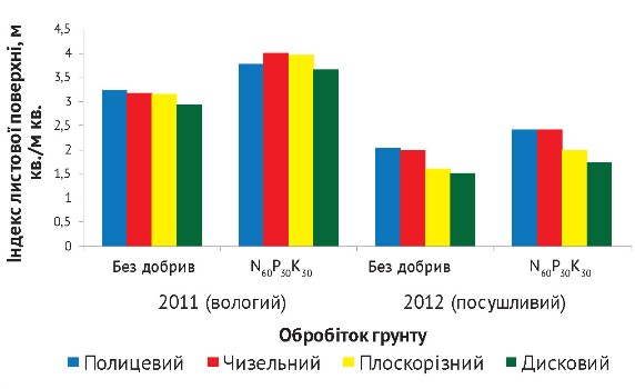 Як відомо, домінуючими ознаками фотосинтезуючої спроможності посівів вважають життєздатність та розміри листового апарату соняшнику, особливо верхнього та середнього ярусів. При визначенні площі листя з 1 рослини та індексу листової поверхні (співвідношення площі асиміляційних органів до одиниці поверхні ґрунту) нами були виявлені закономірності, тотожні для інших біометричних характеристик, а саме: зростання показників у сприятливі за метеорологічними умовами роки, кращий розвиток сукупної листової поверхні за оранки на неудобреному фоні (2,79 м²/ м²) та на чизельному обробітку при внесенні мінеральних добрив (3,11–3,28 м²/м²), позитивний вплив на розміри і тривалість функціонування листя комплексних мінеральних добрив, зокрема з подвійною нормою азоту (N60P30K30) (рис. 1).