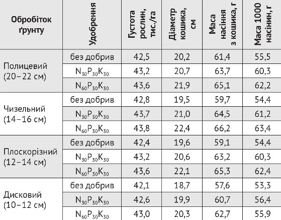 Розміри кошика менше залежали від мінливостей погоди, обробітку ґрунту і удобрення, на відміну від такого показника, як маса насіння з одного кошика. Абсолютні величини її змінювались в інтервалі від 52,2–61,8 г у 2012 році до 64,6–71,2 г у 2013-му, зростали в середньому на 1,7–3,8 г за оранки (фон без добрив) і на 1,1–3,5 г за чизелювання (фон N60P30K30) порівняно з іншими способами обробітку ґрунту. Застосування мінеральних добрив забезпечило стабільний приріст маси насіння з розрахунку на 1 рослину по відношенню до неудобрених ділянок. Аналогічні відмінності по варіантах досліду були характерні і для такого показника, як маса 1000 насінин.
