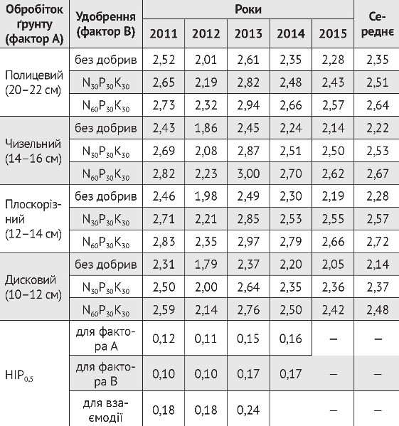 Таблиця 3. Урожайність соняшнику, залежно від обробітку ґрунту та удобрення, т/га