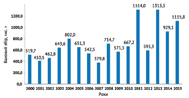 За останні роки у господарствах області спостерігалося значне розширення площ, зайнятих під зерновою кукурудзою: із 192,9 тис. га у 2000 р. до 296,6 тис. га у 2015 році. При цьому, завдяки запровадженню у виробництво високопродуктивних гібридів та активізації інноваційної діяльності в технологіях вирощування цієї культури, в Дніпропетровській області вперше одержано рекордний валовий збір її зерна — понад 1 млн т. Зокрема, в 2011 р. цей показник становив 1314 тис. т, а в 2013-му зібрано абсолютний максимум — більше 1315,5 тис. т. Такі показники підтверджують реальні можливості нарощування обсягів виробництва цієї важливої зернофуражної культури в конкретному регіоні України (рис. 1).