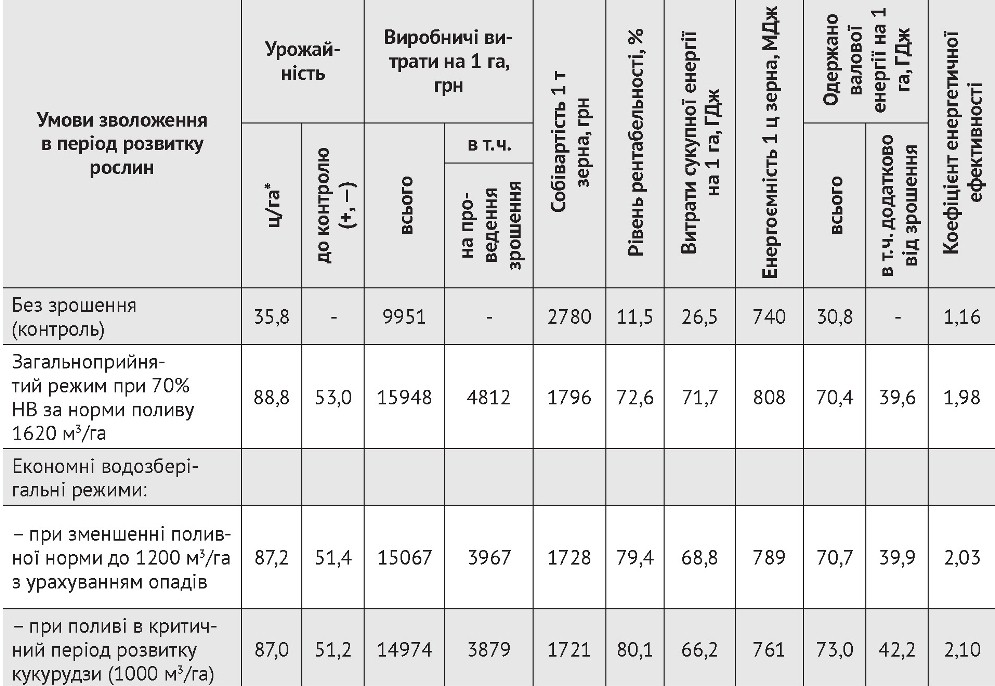Одним із резервів вирішення проблеми гарантованого виробництва кукурудзи в Дніпропетровській області є відновлення її посівів в умовах зрошення. Ця культура досить ефективно використовує потенціал зрошувальних земель. Результати дослідів Інституту зернового господарства (нині Інститут сільського господарства степової зони) та Інституту зрошувального землеробства доводять безперечну перевагу ефективності виробництва зерна цієї культури практично при всіх режимах поливу (табл. 1) . Найбільш ефективним в умовах Дніпропетровської області є варіант при поливі в критичний період розвитку цієї культури з поливною нормою 1000 м3/ га. Цей режим забезпечив найвищі економічні та енергетичні показники.