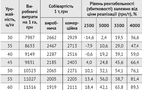 Узагальнення агротехнологічних, економічних досліджень та прогнозних розрахунків, проведених в ДУ Інститут сільського господарства степової зони НААН України та його дослідних станцій станом на початок 2016 року, дозволяє прогнозувати виробничу собівартість тонни зерна кукурудзи при урожайності від 30 до 60 ц/га в межах від 2662 до 1919 грн/т (табл. 2). Виходячи з цього, як свідчить аналіз результатів рівня рентабельності (збитковості), беззбитковий рівень виробництва кукурудзи повинен становити при реалізації її зерна не нижче 2500–3000 грн/т. При підвищенні урожайності до рівня 55–60 ц/га рентабельність її виробництва може зрости до 36,0–42,1% і, як наслідок, будуть створені більш сприятливі умови для розширеного відтворення виробництва.