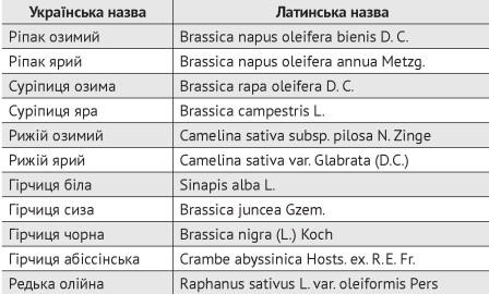 В Україні останніми роками набувають поширення олійні культури з родини Капустяних (Brassicaceae). У табл. 1 наведено їх перелік. Деякі з них сьогодні вже вирощуються на великих площах, а деякі лише проходять випробування.