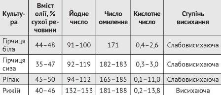 Вміст олії у насінні та її якість у різних культур залежить від виду, особливостей сорту рослин, удобрення, водного режиму, ґрунту й інших умов. Вирішальне значення у підвищенні вмісту олії в насінні має впровадження у виробництво високоолійних сортів і гібридів та застосування досконалої системи насінництва. Окремі олійні культури характеризуються наступними показниками кількості та якості олії (табл. 2).