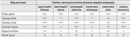 Під час досліджень за домінантними видами шкідників було встановлено, що різні культури не в однаковому ступені пошкоджувались комахами. Згідно з даними, наведеними у табл. 3, видно, що хрестоцвіті блішки віддають перевагу при виборі кормової рослини ріпаку ярому та різним видам гірчиці, меншою мірою — редьці олійній, і взагалі не живились на рижію ярому.