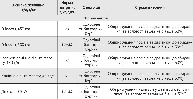 Таблиця 1. Препарати, рекомендовані для десикації зернових культур