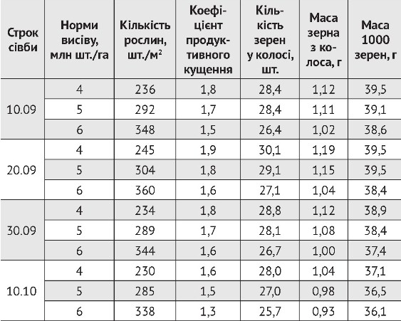 На основі отриманих даних такі показники, як кількість рослин на одиниці площі, їх продуктивна кущистість, маса зерна з колоса, кількість зерен у колосі найкраще поєднувалися за оптимального строку сівби, яким у наших дослідах виявився 20 вересня. Затримка з сівбою до 30 вересня, а тим більше до 10 жовтня негативно позначалася перш за все на густоті стояння рослин, їх продуктивній кущистості, озерненості колоса, масі зерна з колоса та масі 1000 зерен.