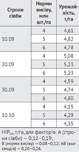 В середньому за роки проведення досліджень найбільша урожайність пшениці озимої була отримана на варіантах, де сівбу проводили 20 вересня з нормою висіву насіння 5 та 6 млн шт./га, яка становила 5,23 т/га. Сівба як у більш ранній строк (10 вересня), так і пізніше (30 вересня) призводила до зниження урожайності на 0,41 та 0,49 т/га.