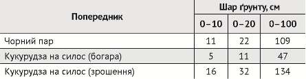 Таблиця 1. Запаси доступної вологи в ґрунті після різних попередників