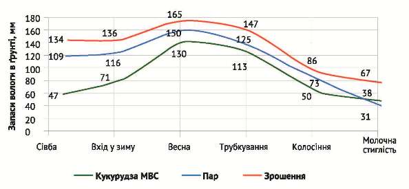 Основна кількість вологи на посівах пшениці накопичується в осінньо-зимовий період. Тому найбільші запаси вологи в ґрунті на її посівах щорічно спостерігаються рано весною (рис. 2). У цей період у шарі ґрунту 1 м запаси доступної вологи в середньому станоловлять: на зрошенні 165 мм, по пару — 150 мм, після непарових попередників — 130 мм,