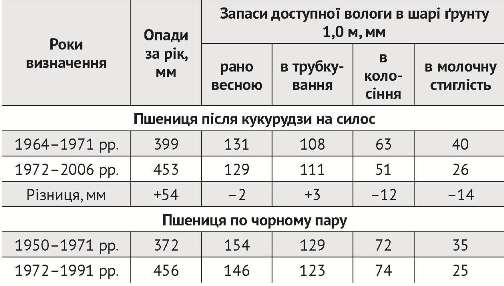 Досліджуючи причини цього явища, ми встановили дуже важливий факт. Як було зазначено вище, у цій зоні кількість опадів за рік збільшилася в середньому на 102 мм, і цілком логічно було очікувати бодай невелике покращення водозабезпеченості посівів пшениці. Натомість виявилося, що збільшення запасів вологи в ґрунті до весни і протягом всієї вегетації на посівах пшениці, майже не відбулося. Так, з 1964 по 1971 роки на посівах пшениці після кукурудзи на силос рано весною запаси доступної вологи в метровому шарі становили в середньому 131 мм, а з 1972 по 2006 роки, коли випадало більше опадів, — 129 мм. Тобто запаси вологи на посівах пшениці при виході із зими не збільшились. В період колосіння і наливу зерна вони навіть були меншими в середньому на 12–14 мм, ніж у роки з меншою кількістю опадів (табл. 2).