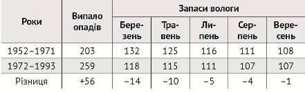 Те саме спостерігається і на посівах пшениці по чорному пару. Так, у середньому за 1950–1971 роки запаси вологи весною становили 154 мм, а за 1972–1991 роки, коли за рік випало в середньому на 84 мм опадів більше, її запаси були навіть меншими — 146 мм. Не збільшувались запаси вологи і в інші періоди вегетації.