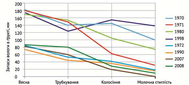 В роки, коли весною на посівах пшениці запаси доступної вологи в метровому шарі ґрунту низькі (до 100 мм), то вони залишаються низькими протягом усього весняно-літнього періоду її вегетації (рис. 3). Опади весняно-літнього періоду у цьому разі зазвичай не виправляють положення. А коли запаси весною високі (170–180 мм), то забезпеченість посівів вологою, як правило, достатня для нормального росту й розвитку рослин до кінця вегетації.