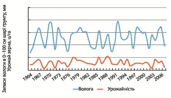 Між запасами вологи в ґрунті весною і врожайністю пшениці існує тісний кореляційний зв’язок r = 0,77–0,83. З рисунка 3 видно, що крива лінія врожаю пшениці добре копіює криву запасів доступної вологи в метровому шарі ґрунту весною.