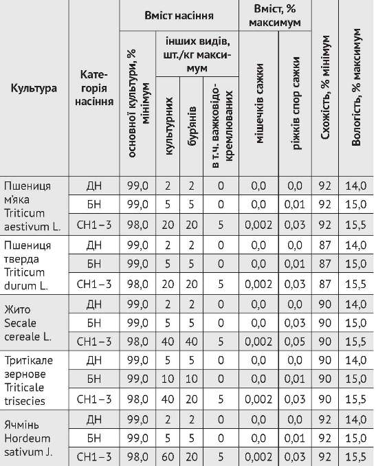 З метою підвищення контролю за якістю виробленої та реалізованої продукції галузі насінництва зернових культур було розроблено і законодавчо затверджено Державні стандарти України: ДСТУ 2240–93, ДСТУ 2949–94 та ДСТУ 4138–2002.
