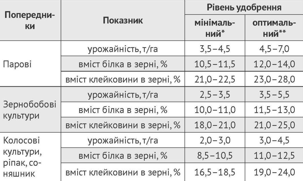 Практичний досвід показує, що після парових попередників навіть за мінімального внесення мінеральних добрив при урожайності пшениці озимої 3,5–4,5 т/га вміст білка в зерні становить 10,5–11,5%, а сирої клейковини — 21,0–22,5%. За оптимального удобрення, яке базується на результатах рослинної та ґрунтової діагностики, урожайність зростає до 4,5–7,0 т/га, рівень білка в зерні збільшується до 12,0–14,0%, а клейковини — до 23,0–28,0% (табл. 1).