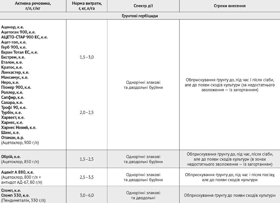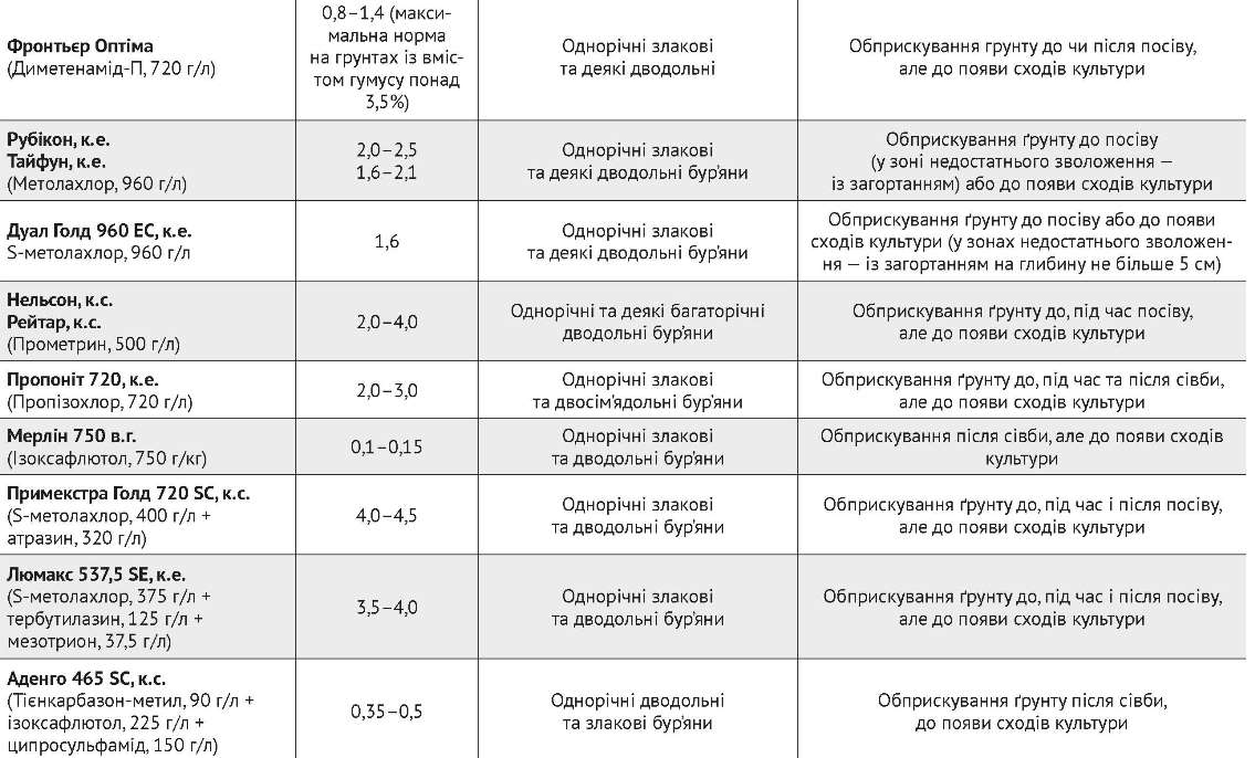 Ґрунтові гербіциди на основі діючих речовин ізоксафлютолу, пендиметаліну, диметенаміду, метолахлору, S-метолахлору, S-метолахлору у поєднанні з атразином, S-метолахлору у поєднанні з тербутилазином, S-метолахлору разом із тербутилазином та мезотріоном забезпечують практично повний захист посівів на ранніх етапах росту та розвитку культури від однорічних тонконогових і широкого спектру дводольних бур’янів. Сумішеві препарати на основі діючих речовин S-метолахлору у поєднанні з атразином, S-метолахлору із з тербутилазином мають у своєму складі два компоненти, тому контролюють значно ширший спектр дводольних бур’янів, ніж ацетохлорні препарати.