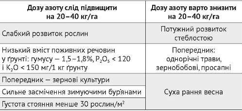 Якщо весна холодна і затяжна — підживлення проводять двічі по 50 кг/ га діючої речовини азоту (табл. 1).