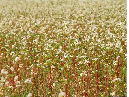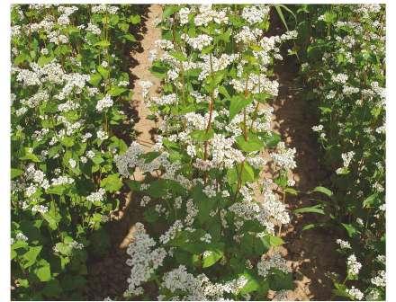 У фазі цвітіння висота рослин гречки залежала від мінеральних добрив. Найвища різниця до контролю була у варіантах при розрахунку добрив балансовим методом на 2,0 т/ га: при широкорядному способу сівби — 17,3%, а при звичайному рядковому — 20,1%.