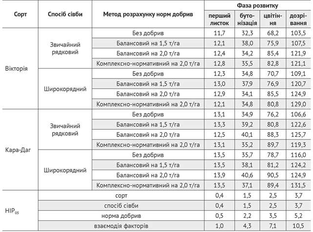 Сорт Кара-Даг є інтенсивним і формує більшу надземну масу, ніж сорт Вікторія. У фазі першого листка маса рослин сорту Кара-Даг у контрольному варіанті була більшою, ніж сорту Вікторія на 8,2%, у фази бутонізації, цвітіння та дозрівання вона була більшою, відповідно, на 20,0, 11,5 та 5,4%. Застосування добрив при вирощуванні сорту Кара-Даг призводило до посиленого накопичення маси рослин. Так, у період дозрівання маса однієї рослини у варіантах з добривами звичайного способу сівби була більшою, ніж на фоні без добрив на 36,3–65,8%, а за широкорядного — на 20,3–48,6%. Більшими показниками характеризувалися рослини варіанту з внесенням добрив, розрахованих балансовим методом на урожайність 2,0 т/га.