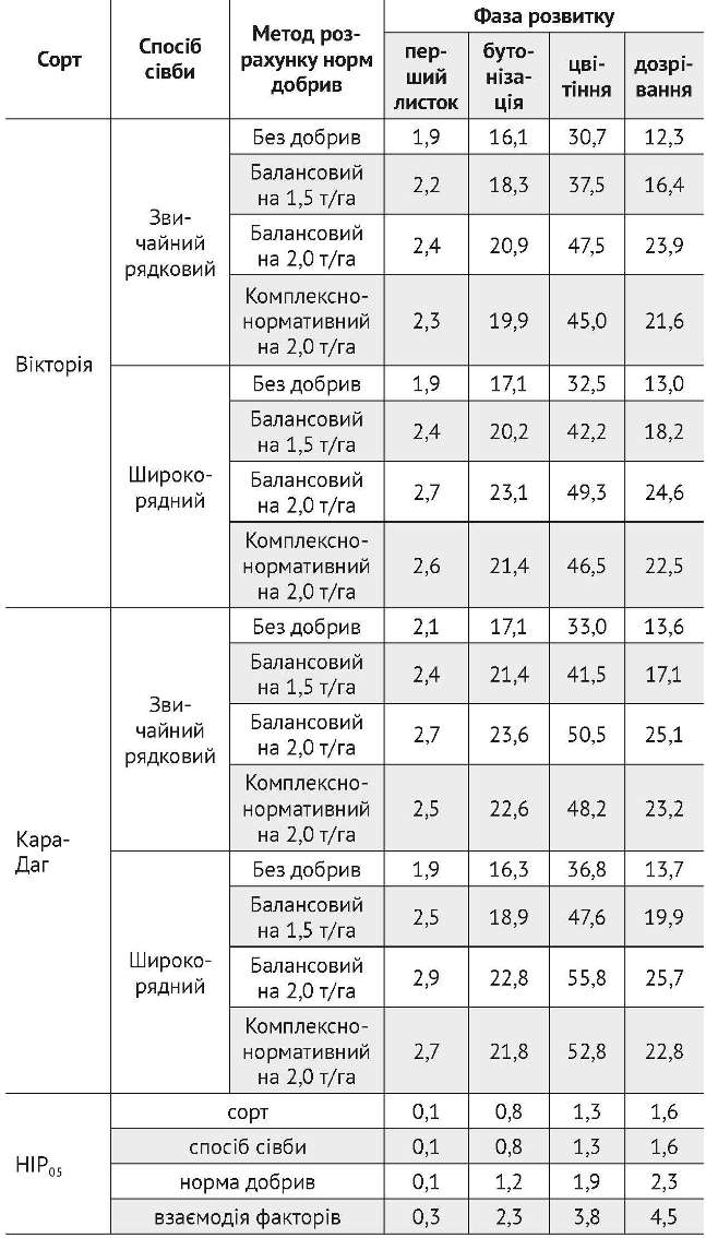 Нашими дослідженнями встановлено, що порівняно з контролем, застосування мінеральних добрив призводило до істотного збільшення площі листкової поверхні у фазі першого листка. Більших значень площі асиміляційної поверхні досягали рослини у варіантах із внесенням добрив, розрахованих балансовим методом на врожай 2,0 т/га при широкорядному способу сівби сорту Кара-Даг — 2,9 тис. м²/га, а у рослин сорту Вікторія цей показник був меншим на 0,2 тис. м²/га, або 6,9% (табл. 2).