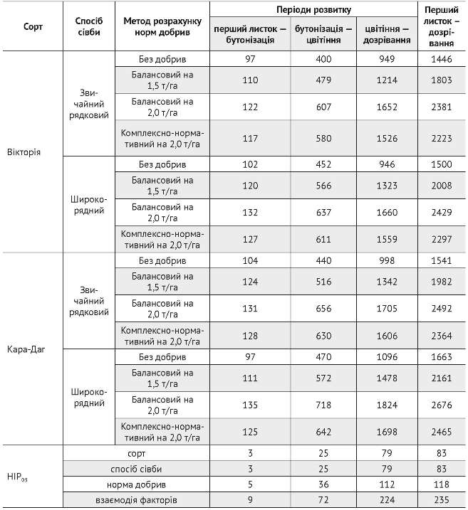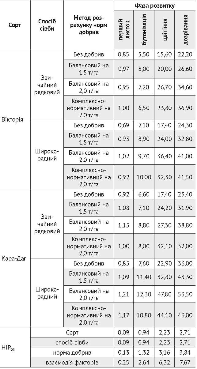 На темпи наростання площі листкової поверхні мінеральні добрива позначалися більше, аніж способи сівби. Так, у варіантах без добрив асиміляційна площа при різних способах сівби сорту Кара-Даг зросла у 1,90–2,26 разів за період від бутонізації до цвітіння, а при застосуванні норм добрив, розрахованих різними методами на урожайність 2,0 т/га, — у 2,13–2,45 разів.