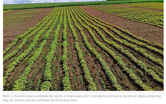 Біологічною особливістю проса є повільний ріст та розвиток рослин у початкові фази розвитку, тоді як гречка стрімко набирає вегетативну масу (фото 1).