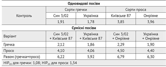 Сорт гречки Син 3/02 та проса Омріяне показали вищу урожайність як на контролях, так і в сумісних посівах. Проте у сумісних посівах ті ж сорти формували різну врожайність, тобто сортові особливості в таких агроценозах мають певне значення. Найкращий симбіоз спостерігався при поєднанні в одному посіві сорту гречки Син 3/02 і сорту проса Омріяне, загальна урожайність зерна на цьому варіанті становила 6,22 т/га, тоді як гречки в одновидовому посіві було отримано 1,91 т/га, а проса — 3,85 т/га.